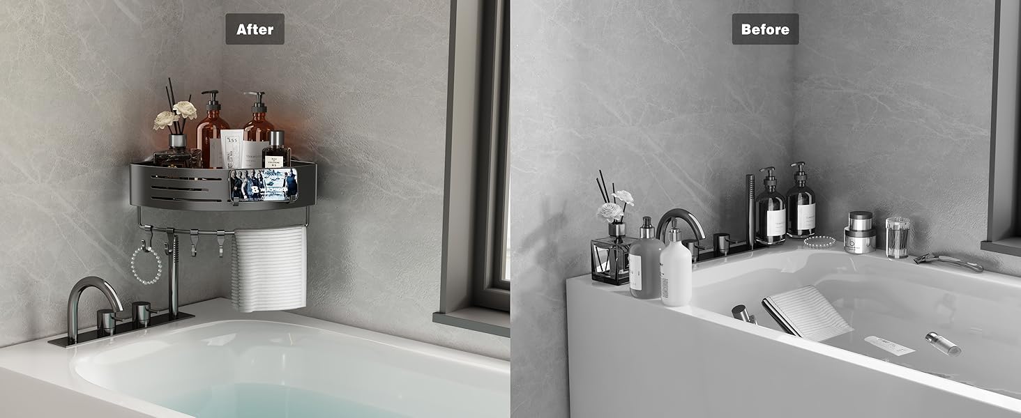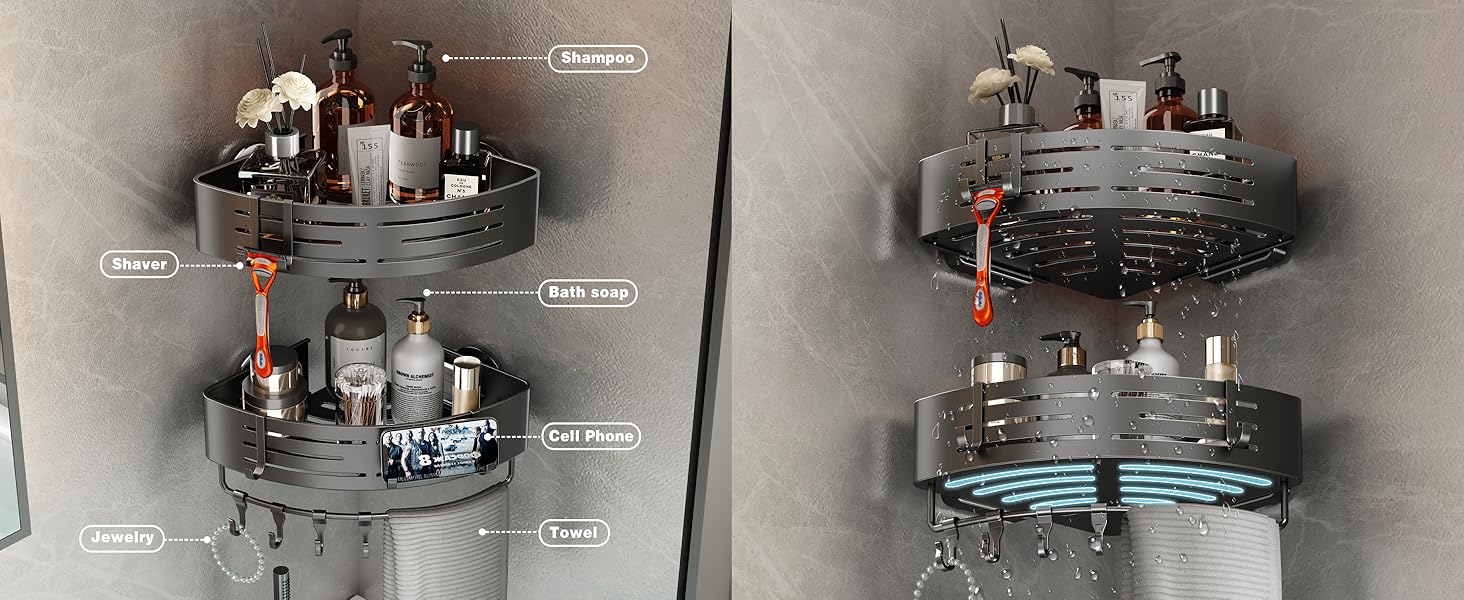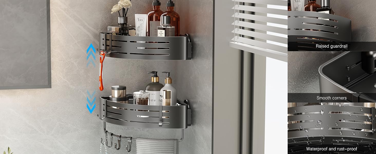 Voldra Corner Shower Caddy Suction Cup, 2 Pack Corner Shower Shelves No Drilling, Aluminum Upgrade Suction Cup Shower Organizer with Towel Bar & Hooks Removable Bathroom Storage Rack(Gray)