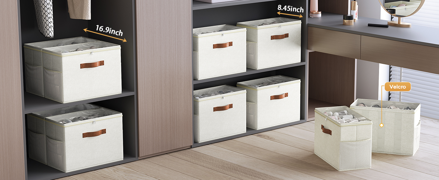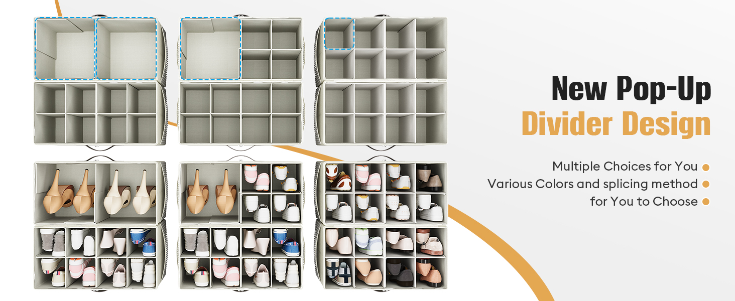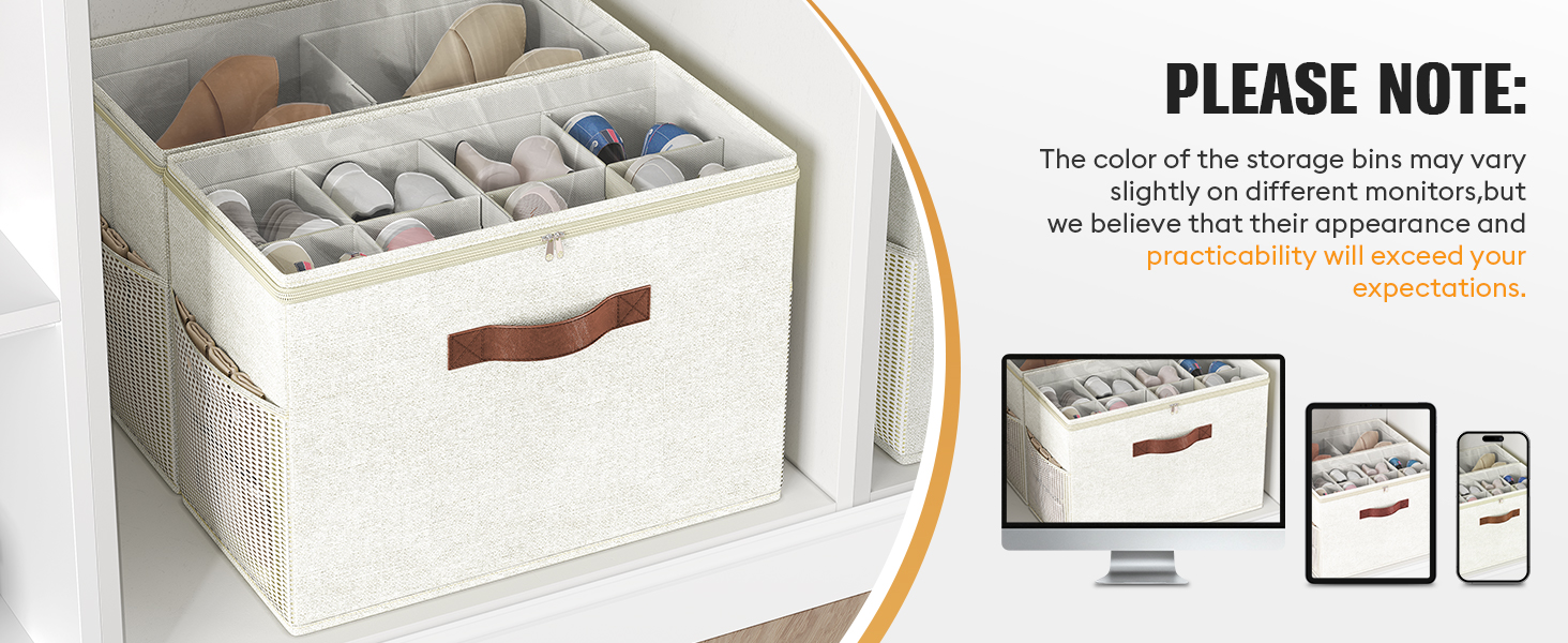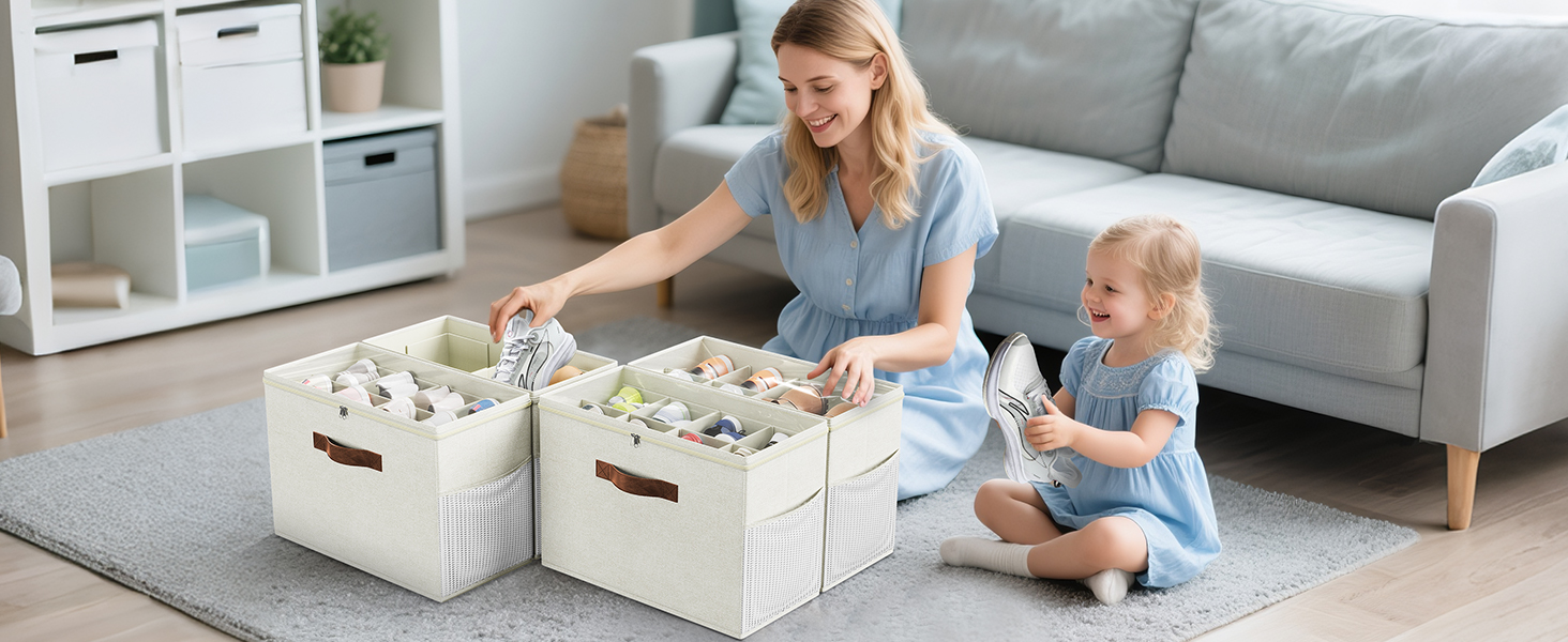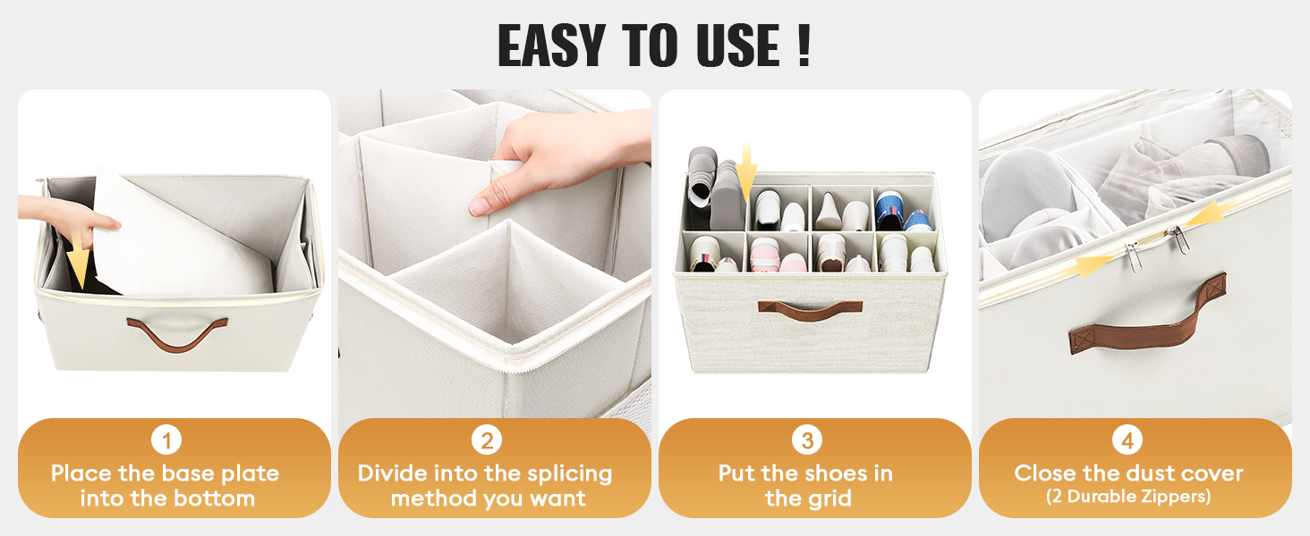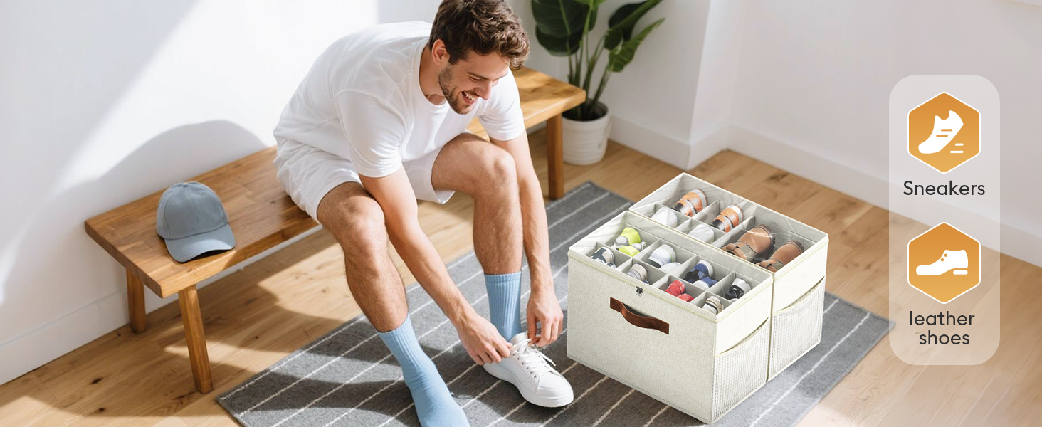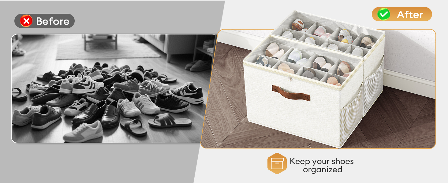 2 Pack Shoe Organizer for Closet, Clear Foldable Shoe Storage Containers Adjustable Dividers Fits 16 Pairs,Shoe Storage Bins Baskets Boxes with Reinforced Handles Beige
